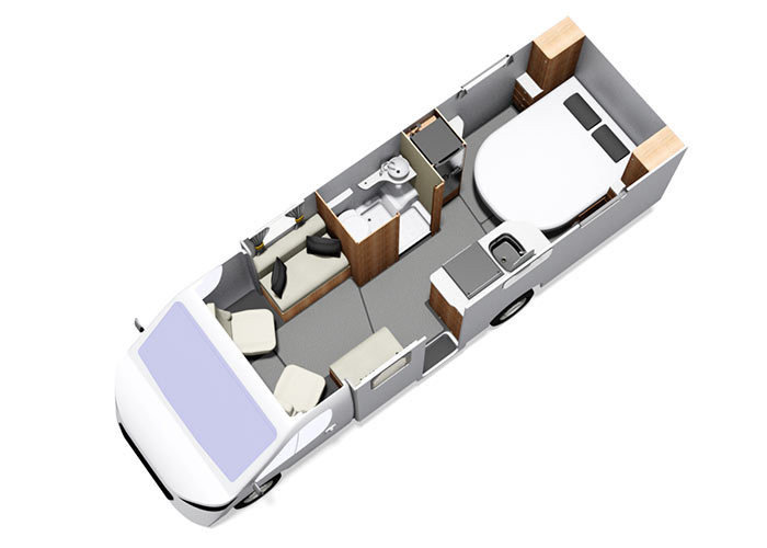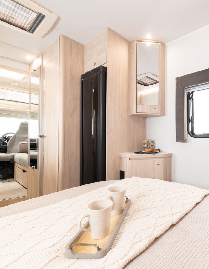 The motorhome has all the extras you would expect from a modern luxury motorhome, including air conditioning, rear parking camera, flat screen TV, fully fitted kitchen and sleek overhead lockers with ambient lighting for stylish storage. A fully equipped kitchen area provides cooking facilities including three ring gas hob, gas oven, sink and 78l fridge freezer. The separate bathroom has a sink, vanity unit, flushing toilet and shower. Sleeping arrangements are provided with a luxury double fixed island bed at the rear, with a further double bed provided by easily converting the dining seating.